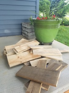 After all the pieces were cut I sanded them down because they were pretty rough.  I was pleasantly surprised by what lie beneath the surface of the wood planks.  The pieces were so pretty!!  I loved how the wood grain popped to the surface once all the dirt and grim was sanded away.